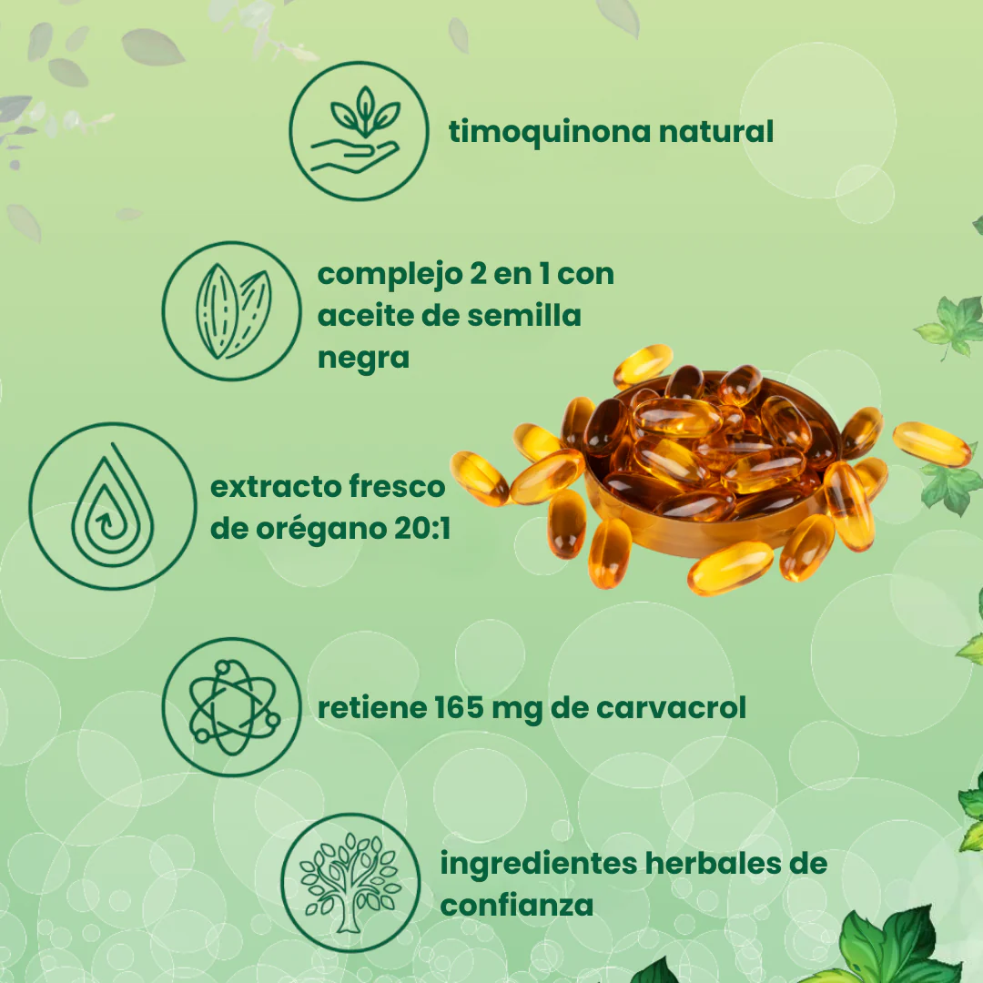 - Concentración: 6.000 mg aceite de orégano (165 mg de carvacrol) + 200 mg aceite de semilla negra (timoquinona natural).