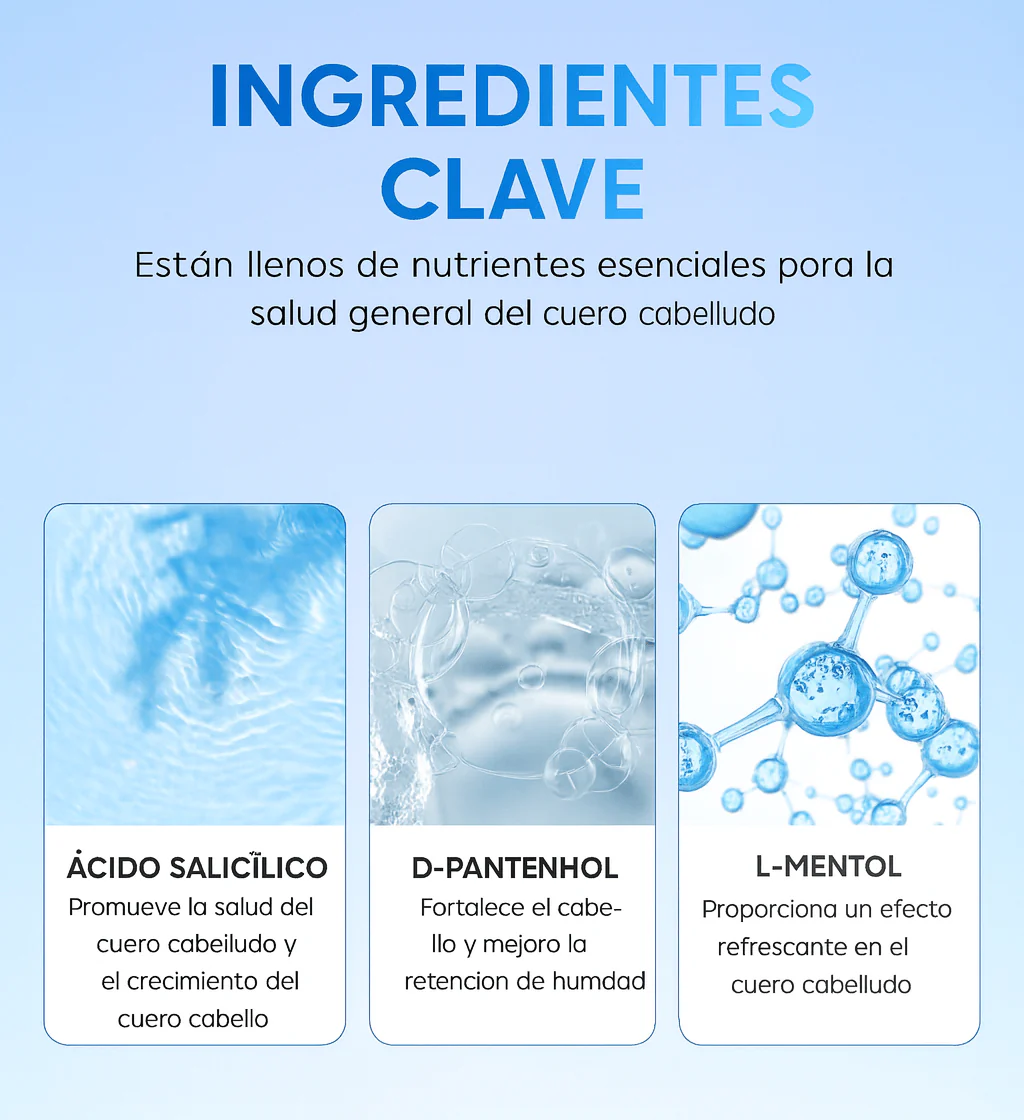 Refrescante alivio con L-Mentol y Dexpantenol: Calma el cuero cabelludo, mejora la absorción de nutrientes y favorece el crecimiento.
