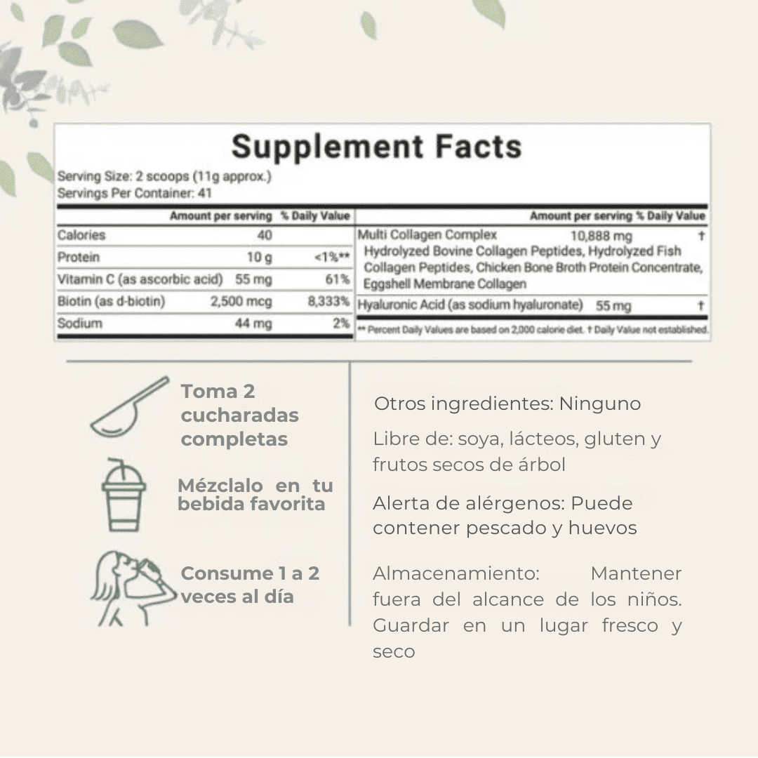 - Ingredientes: colágeno bovino, marino, de pollo y de cáscara de huevo (tipos I, II, III, V y X).